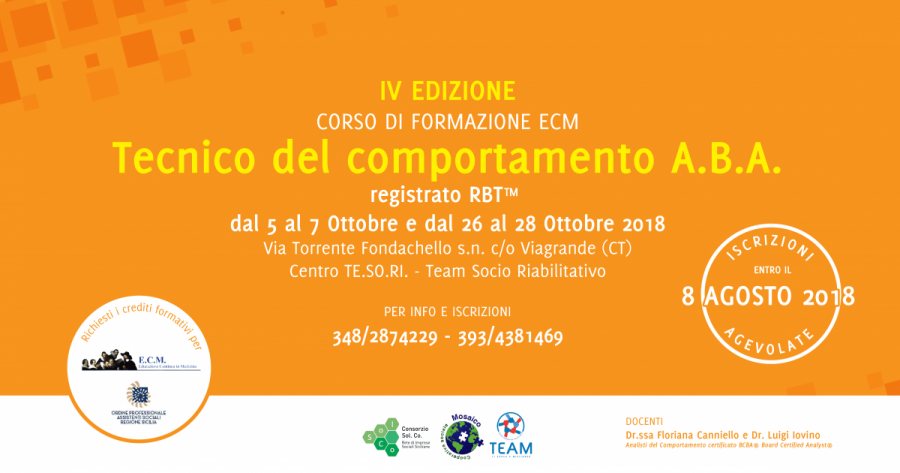 Il Corso, di cui trovate in allegato il programma, che si terrà a Viagrande (CT) in Via Torrente Fondachello s.n. c/o il Centro TE.SO.RI. nei giorni 05-06-07 ottobre e 26-27-28 ottobre 2018, sarà fornito indipendentemente dal BACB®.